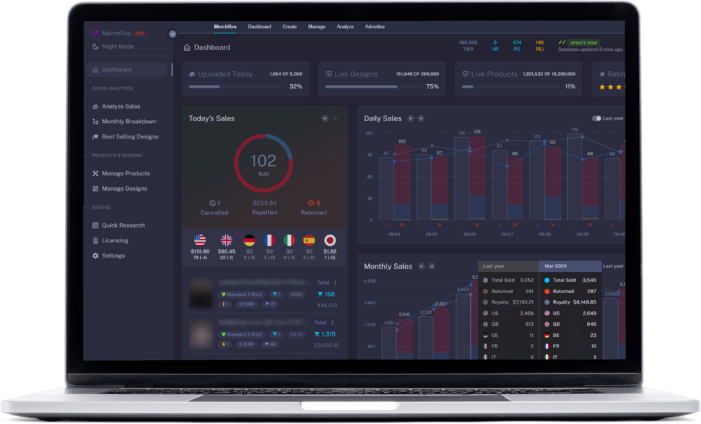 MerchRex Combo is a research and analysis toolkit that provides a detailed dashboard and represents Amazon product and sales data in a way that improves your Merch on Demand experience.